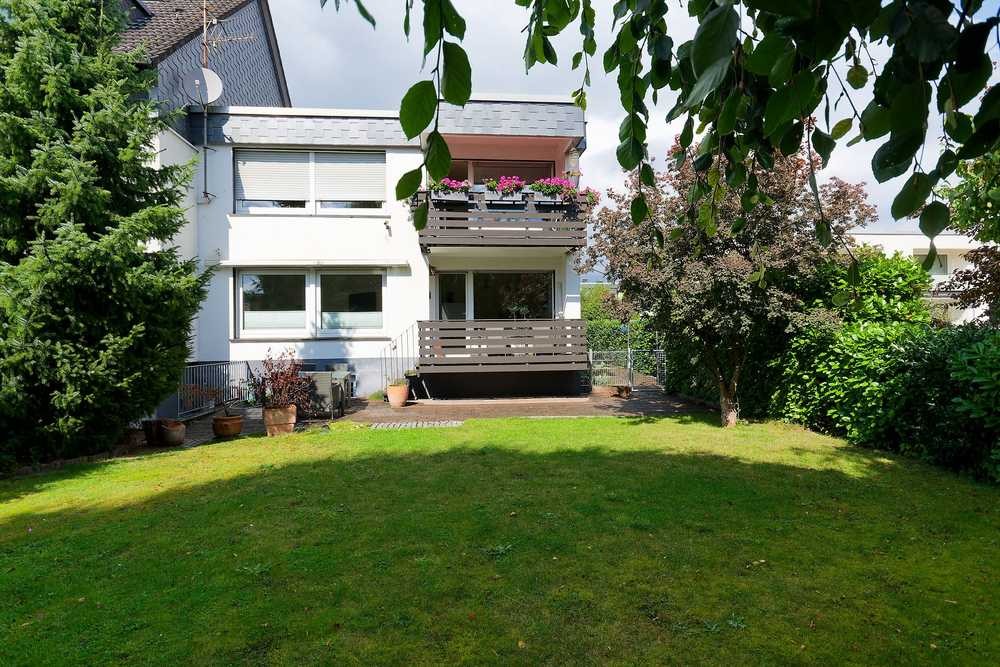 Von dem linken der der drei Räume gelangt man auf den teilüberdachten Balkon mit direktem Zugang zum Garten. Der Garten ist pflegeleicht angelegt und besticht durch einen alten Baumbestand, welcher einen guten Sichtschutz zur Nachbarschaft bietet.