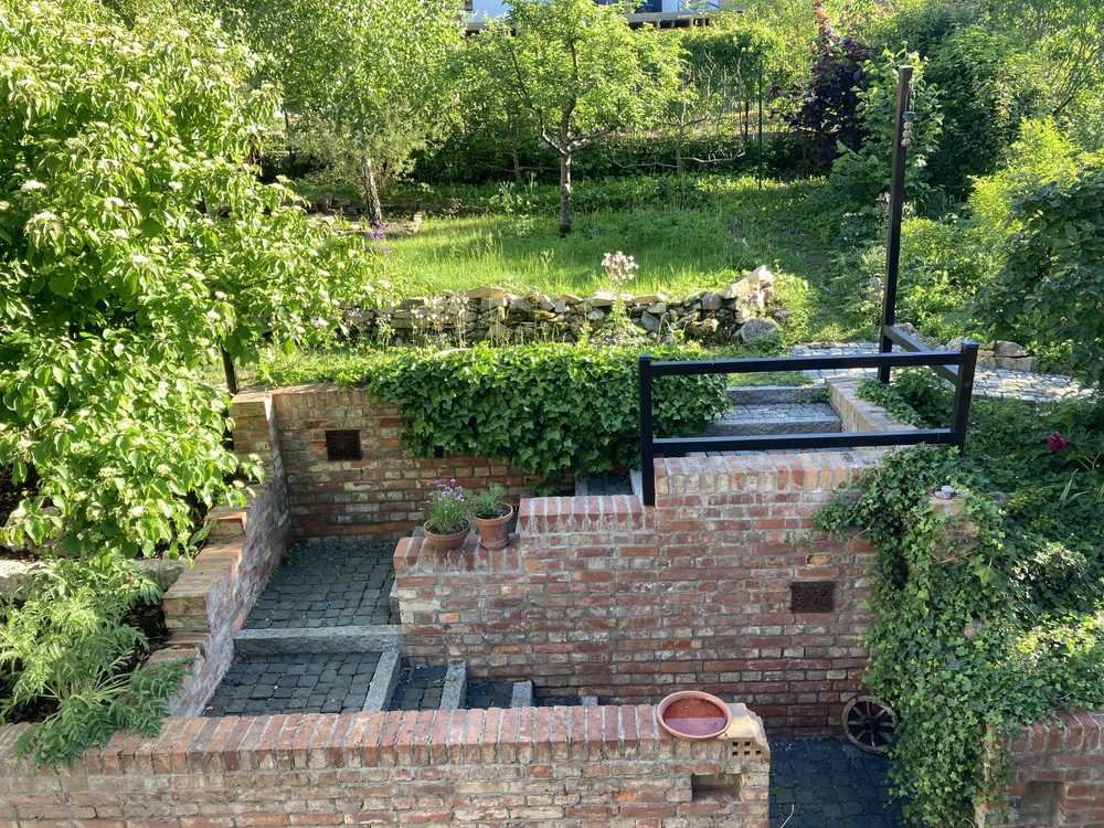 • Über breite Steintreppe erreichbarer Garten mit Obstbäumen & Blumen