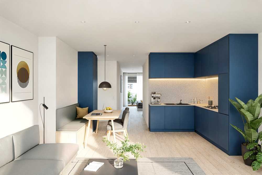 Der Wohn- und Essbereich bleibt dennoch klar strukturiert und gut möblierbar. Die integrierte Küche fügt sich harmonisch ein, ohne den Raum zu überladen. Das Schlafzimmer ist angenehm proportioniert und bietet ausreichend Platz für Stauraum und Ruhe. Die Diele schafft eine gut organisierte Eingangssituation mit kurzen Wegen und einer ruhigen Trennung der Bereiche.