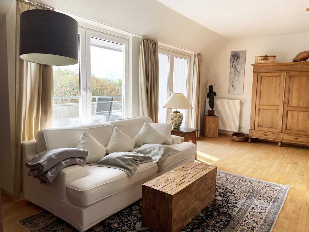 Das Apartment betritt man von hier aus nach rechts. Der ganze Wohnbereich ist mit hochwertigem Echtholz-Parkett ausgelegt. Das passt ausgezeichnet zu den mit Raufaser gestalteten, in zarter Cremefarbe gestrichenen Wänden, was die besonders schönen Möbel und Kunstobjekte wirkungsvoll in Szene setzt.