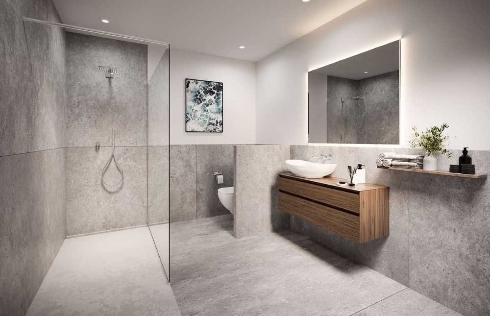 Das Badezimmer ist modern und hochwertig ausgestattet – mit einer begehbaren Dusche, einem stilvollem Waschtisch und hochwertigen Armaturen.