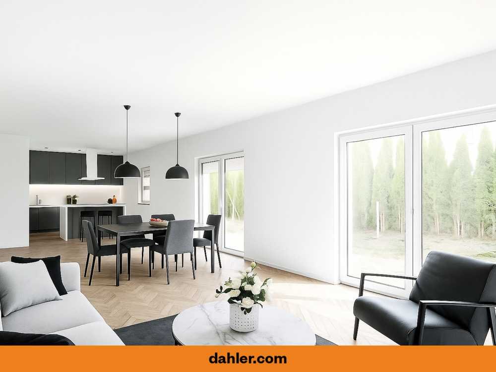 Dieses moderne Einfamilienhaus im Erstbezug wurde im Jahr 2025 fertiggestellt und verteilt sich auf circa 150 Quadratmeter Wohnfläche zzgl. 60 Quadratmeter Nutzfläche und einem begrünten Garten.
