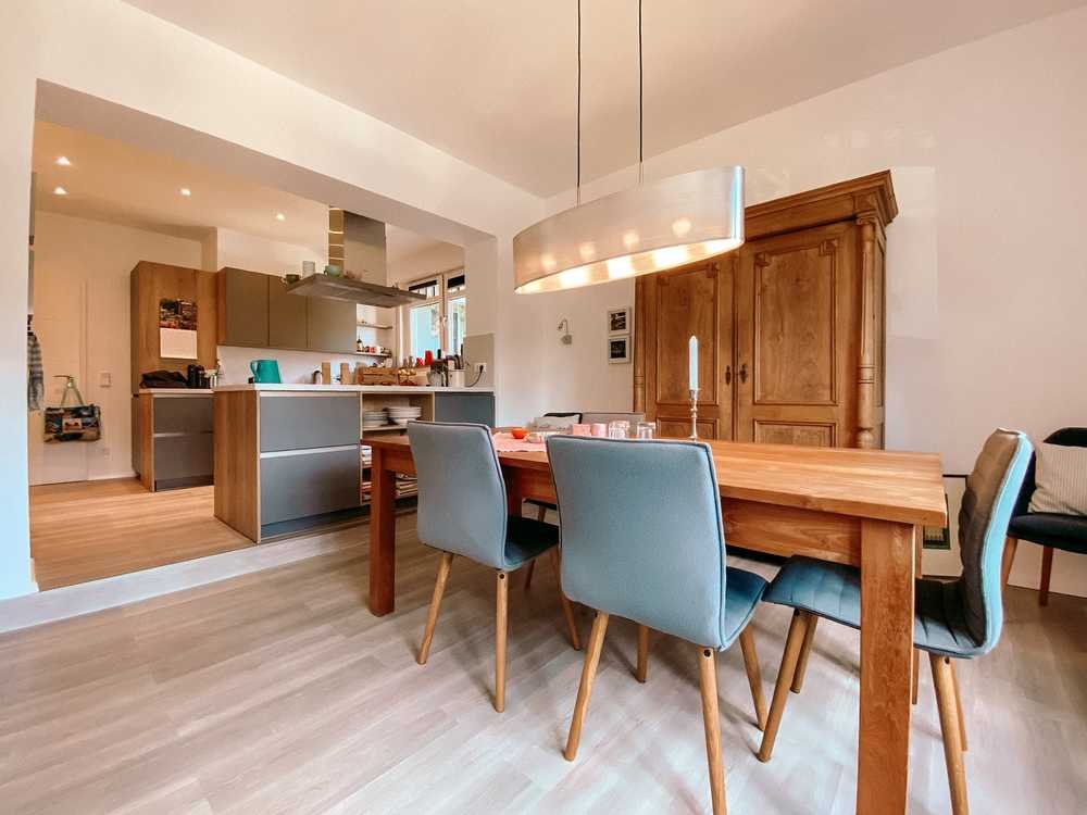 Bereits das Erdgeschoss überzeugt mit einer durchdachten und familienfreundlichen Raumaufteilung. Der weitläufige Wohnbereich bildet zusammen mit dem angrenzenden Esszimmer das Herzstück des Hauses. Große Fenster sorgen für viel Licht und einen offenen Blick in den liebevoll angelegten Garten mit altem Baumbestand, der direkt vom Wohnbereich aus zugänglich ist und eine grüne Oase der Ruhe bietet. Zwei Kinderzimmer, ein großes Schlafzimmer sowie eine abgeschlossene Küche, ein voll ausgestattetes Bad und ein separates Gäste-WC bieten ein komfortables Wohnen auf einer Ebene.