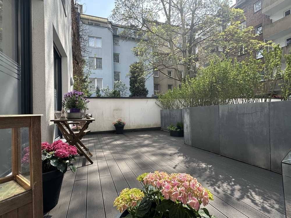 Ein besonderes Highlight sind die beiden Terrassen – eine Innenterrasse sowie eine Außenterrasse – die zum Entspannen und Genießen im Freien einladen. Das Loft befindet sich in einer ruhigen Lage im Hinterhof der beliebten Roßstraße 45 in Düsseldorf, was eine angenehme Ruhe trotz zentraler Lage garantiert.