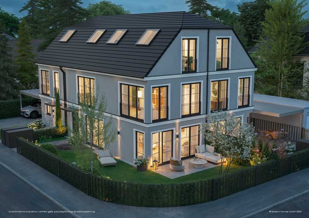 An einer ruhigen Anwohnerstraße entstehen drei moderne Stadthäuser mit großzügigen Terrassen, die nach Süden und Westen ausgerichtet sind, sowie einladenden Gärten. Das Ensemble überzeugt durch zeitlose Architektur, klare Linien und eine hochwertige Ausstattung.