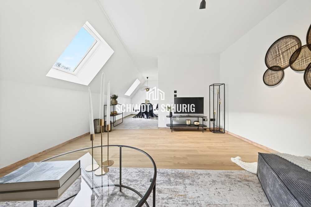 Der offene Küchenbereich bildet das kommunikative Zentrum der Wohnung und bietet direkten Zugang zum ca 25m² großen Balkon mit Wasseranschluss, auf dem sich sonnige Stunden bei einem Gläschen Wein oder die Tasse Kaffee am Morgen genießen lassen.