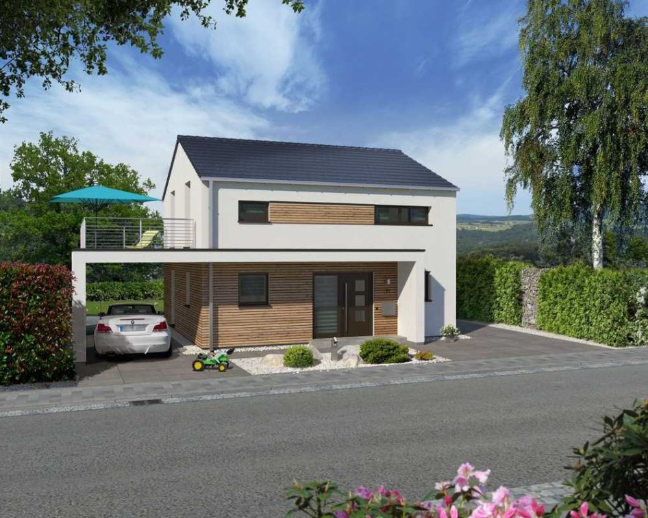 Das moderne Energiespar-Haus ist in der Architektur geprägt von einem überdachten Hauseingangsbereich, der sich fließend fortsetzt und sich mit der Garage zu einem Gestaltungselement verbindet. Eine überdachte Terrasse und eine weiterführende Gestaltung mit Luftbalken gestalten und prägen die Gartenseite des Hauses. Im Erdgeschoss ist ein großer Wohn-/Essbereich mit einer offenen Küchengestaltung geplant.