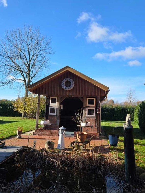 Ein ehemaliges Fachwergbackhaus, restauriert und zum Grillhaus mit vorliegender Terrasse umgebaut.