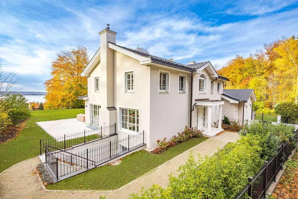 Dieses hochklassige Familiendomizil begeistert durch seine erhabene Lage oberhalb des Ammersees, durch fantastische Panoramablicke auf den See, eine exquisite Ästhetik und die äußerst detailreiche, stilvolle Ausstattung. Die Inspiration für die Architektur lieferten klassische Gründerzeitvillen – diesen unvergänglichen Stil reflektiert die Fassade mit einem Säulenportal, einem Mittelgiebel samt charmantem Rundbogenfenster und von dekorativen Putzfaschen gerahmten Sprossenfenstern.