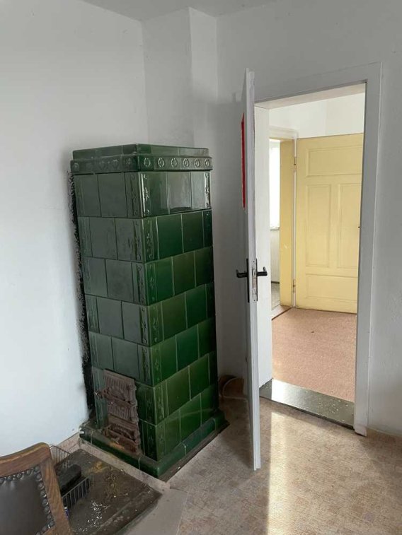 dezentrale Ofenheizung Zwei Kachelöfen: 1x Gründerzeit, 1x 80er Jahre, Kohlebadeofen im Bad