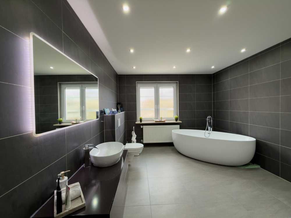 Das elegante Familienbad mit freistehender Badewanne, begehbarer Dusche und Doppelwaschtisch sorgt für Wellness-Feeling im Alltag.