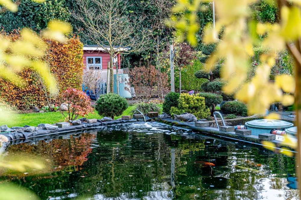 Das Wohnhaus bietet eine Wohnfläche von ca. 118 m² zuzüglich voller Unterkellerung. Im Erdgeschoss befinden sich das Wohn- und Esszimmer mit Küche, Flur und Gäste-WC. Die überdachte Terrasse wurde nachträglich zu einem sog. Wintergarten umgestaltet. Von hier aus gelangt man in den tollen Garten mit dem großen Fischteich.
