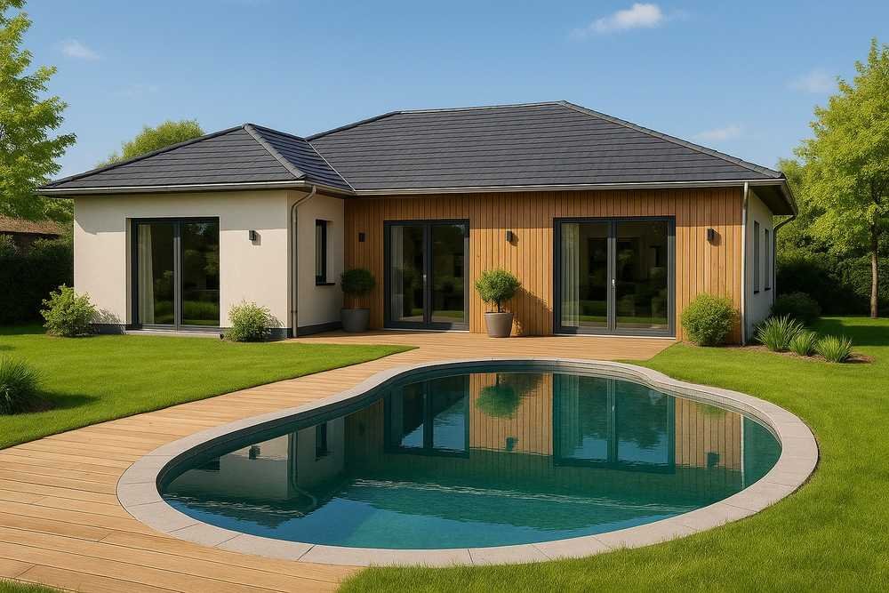 Der Bungalow Lifetime 7 überzeugt durch seine beeindruckende Raumgröße von 176,91 m² und bietet Ihnen ein Wohnen mit zusätzlichem Komfort. Besonders hervorzuheben ist der moderne, offene Wohn- und Essbereich, der in Kombination mit der großzügig gestalteten Küche lichtdurchflutet ist, dank der zwei großen Fensterflächen.