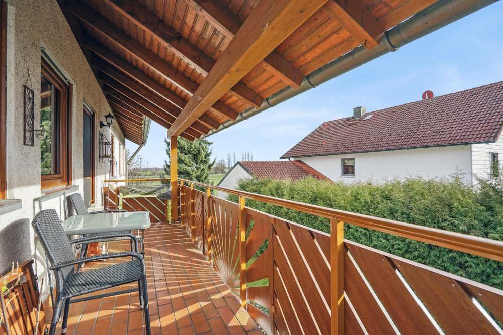 Von hier aus gelangen Sie auf den südlich ausgerichteten Balkon mit Blick ins Grüne. Hier können Sie den ganzen Tag die Sonnenstrahlen genießen.