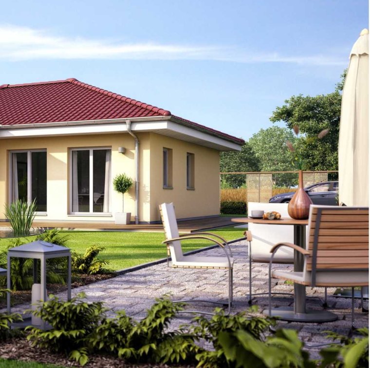Das Konzept überzeugt durch seine durchdachte Raumaufteilung: Offene Wohnbereiche verschmelzen harmonisch miteinander und schaffen eine großzügige Atmosphäre. Der direkte Gartenzugang vom Schlafzimmer lädt zum Entspannen ein, während das integrierte Arbeitszimmer Flexibilität für Home-Office-Lösungen bietet. Zusätzliche Erker und intelligente Bauteile erweitern den Wohnkomfort und schaffen mehr Raum, ohne die kompakte Grundfläche zu sprengen.