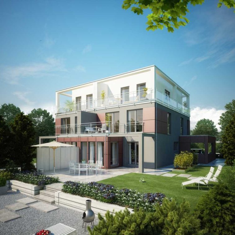Dieses Doppelhaus mit Flachdach überzeugt nicht nur mit einem komfortablen Platzangebot im Innern, sondern vor allem auch durch seine attraktive Gestaltung. Ins Auge fallen sofort der Wintergarten-Erker, auf dessen Dach sich ein sonniger Balkon befindet, sowie der Design-Carport. Beide Architektur-Bauteile werden von eleganten rotbraunen Fassadenplatten umhüllt, die harmonisch mit der grauen Mineralputzfassade des Haupthauses zusammenspielen. Das Design wird im ersten Obergeschoss auf attraktive Weise fortgeführt. Zurückhaltender - sowohl in der Größe als auch in der Farbgestaltung - präsentiert sich das zweite Obergeschoss. So wirkt das Fertighaus trotz seines beeindruckenden Volumens angenehm leicht. Durch die kleineren Abmessungen entsteht zudem eine umlaufende Dachterrasse , die von einer filigranen Pergola sowie einer transparenten Glasbrüstung eingerahmt wird. Ergänzt wird das Architektur-Konzept durch großzügige Verglasungen auf allen Ebenen, die im Hausinnern ein luftiges Ambiente schaffen. Hinter der Haustür finden sich die Bewohner und Besucher in einer geräumigen Diele wieder, an die das Gäste-WC und ein Technikraum angrenzen. Für Jacken, Taschen und Schuhe steht ein separater Garderobenbereich bereit. So herrscht im Eingangsbereich stets eine aufgeräumte Optik vor. An die Diele schließt sich ein Flur an, der in den weitläufigen Wohn-, Ess- und Kochbereich führt. Hier schlägt eindeutig das Herz des Hauses: An der langen Küchenzeile wird gemeinsam gekocht, am langen Esstisch gegessen und auf der gemütlichen Couch entspannt. Der luftige Platz im Wintergarten-Erker bietet sich für eine trendige Lounge-Ecke an. Die privaten Ruhe- und Rückzugsbereiche befinden sich in den beiden oberen Etagen. Das erste Obergeschoss ist mit zwei Kinderzimmern und einem geräumigen Kinderbad mit Wanne und Dusche für den Nachwuchs reserviert. Ergänzt wird das Raumprogramm von einem flexibel nutzbaren Zimmer mit Zugang zum Balkon. Den Eltern steht das komplette zweite Obergeschoss als Relaxzone zur Verfügung. Eine schmale Empore führt zu einem lichtdurchfluteten Schlafzimmer mit angrenzendem Ankleidebereich und Wellnessbad.