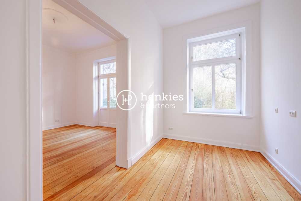 anderem die Elektrik erneuert sowie alle Wände glatt verputzt und frisch gestrichen. Der edle Pitchpine-Dielenboden, der gerade abgeschliffen und neu versiegelt wurde, und der kunstvolle Stuck aus dem frühen 20. Jahrhundert schaffen ein stilvolles Ambiente, das jeden Altbau-Liebhaber begeistert.