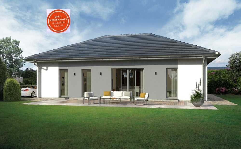 OAKL AKTIONSTAGE - NUR FÜR KURZE ZEIT - Unser Bungalow 1 Walmdach bietet auf einer Wohnfläche von 107 m² alles, was die Kleinfamilie zum Wohnen und Wohlfühlen benötigt. Das kombinierte Wohn-Ess-Zimmer ist großzügig geschnitten und dank drei Glastüren zum Garten hin schön hell. Auch die vom Esszimmer türlos zugängliche Küche bietet genügend Platz und Tageslicht. Der angrenzende, 10 m² große Hauswirtschaftsraum ist auch direkt von außen betretbar und hat dadurch gleich in doppelter Hinsicht einen praktischen Nutzen: Einkäufe können auf diese Weise direkt versorgt werden und die Wohnräume bleiben von möglichen Schmutzschuhen verschont. Der ebenfalls geräumige Flur verbindet den Wohnbereich des Hauses mit den privaten Rückzugsorten: dem Bereich der Eltern mit Schlafzimmer und angeschlossener Ankleide und einem lichtdurchfluteten Kinderzimmer. Ein voll ausgestattetes Bad mit Badewanne und Dusche sowie ein Gäste-WC runden das Angebot ab.