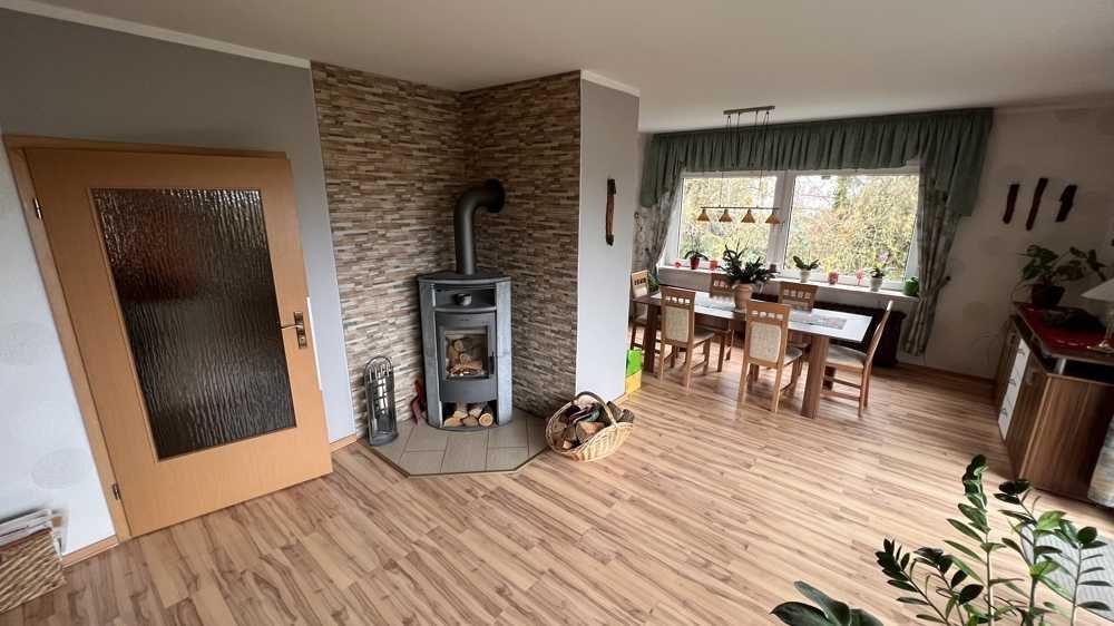 Das Herzstück des Hauses bildet der großzügige Wohn- und Essbereich mit seinem behaglichen Kamin, der an kalten Tagen für Wärme und Gemütlichkeit sorgt.