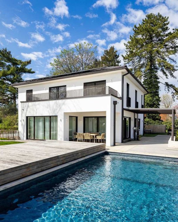 Das klare, frische Design in Kombination mit markanten dunklen Akzenten verleiht dem Haus eine moderne, zeitlos-exklusive Ästhetik. Das Flachdach verstärkt den architektonischen Charakter, während großzügige Verglasungen mit Raffstores für natürliche Lichtfülle sorgen – lichtdurchflutete Räume, maximale Privatsphäre und ein unvergleichliches Wohnambiente.