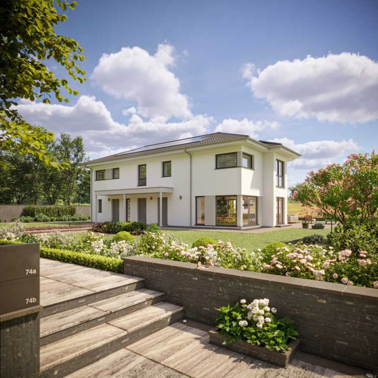 Das Bien-Zenker Celebration 274 ist ein beeindruckendes Beispiel für modernes und flexibles Wohnen. Mit einer großzügigen Wohnfläche von 274 m² und insgesamt 5.5 Zimmern bietet dieses Fertighaus ausreichend Raum für Familien und Mehrgenerationen. Ob mit Sattel-, Walm- oder Pultdach, die Gestaltungsmöglichkeiten sind vielseitig und passen sich Ihren Wünschen an. Im L-förmigen Erdgeschoss entsteht ein geschützter Sitzplatz, der zum Entspannen und Verweilen einlädt. Die großzügige Wohneinheit im Erdgeschoss bietet Platz für bis zu vier Personen, während die kleinere Einheit im Obergeschoss ideal für Großeltern oder eine kleine Familie ist. So entsteht ein harmonisches Zusammenleben unter einem Dach, das Privatsphäre und Gemeinschaft perfekt miteinander verbindet. Darüber hinaus erfüllt das Haus die Anforderungen des staatlichen Qualitätssiegels QNG, was für mehr Energieeffizienz und Wohngesundheit sorgt.
