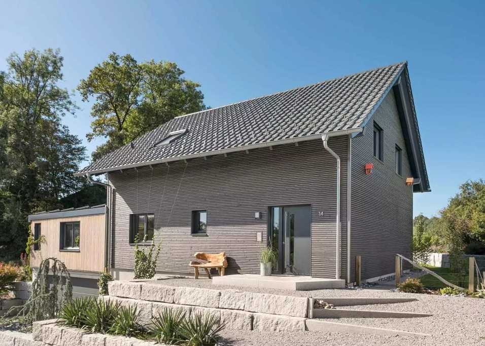 Dieses attraktive 1,5-geschossige Architektenhaus besticht durch seine warme Holzfassade und das klassische Satteldach mit hochwertiger Tondachziegeleindeckung. Es bietet eine durchdachte Raumaufteilung, ideal für Familien.