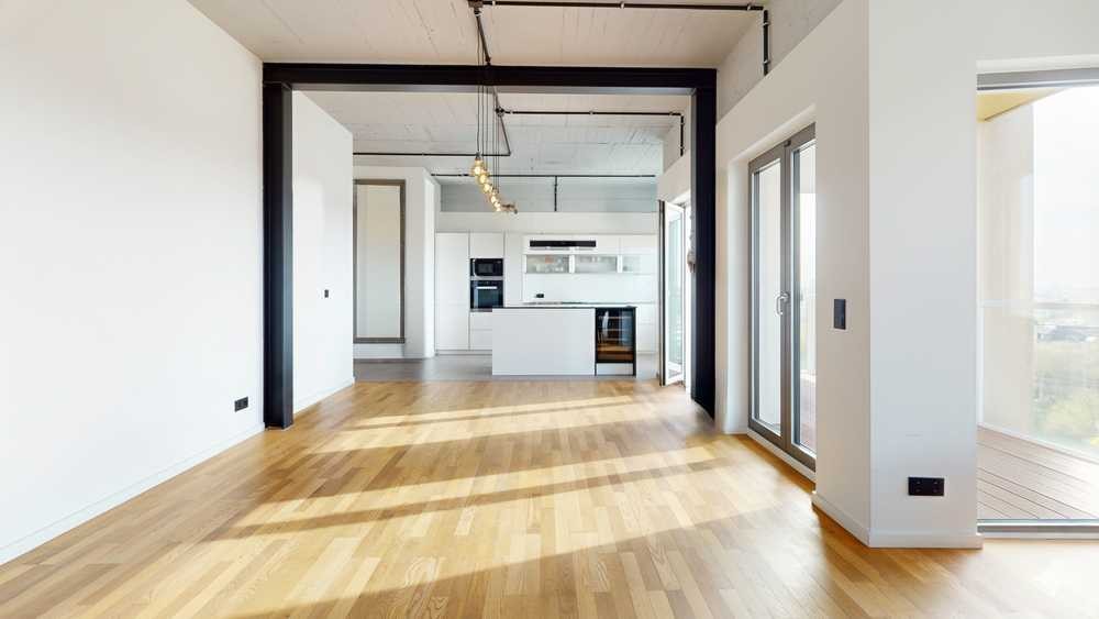 Die Wohnung wurde ursprünglich aus vier separaten Einheiten zusammengelegt und als loftartiges Konzept mit durchgehendem Grundriss realisiert. Das Zentrum bildet ein ca. 73 m² großer, offen gestalteter Wohn-, Ess- und Küchenbereich. Eine Raumhöhe bis zu 3,20 m sowie bodentiefe, dreifachverglaste Schüco-Fenster lassen viel Tageslicht einfallen und schaffen ein außergewöhnlich offenes Raumgefühl. Die massive Stahlbetondecke ist mit einem integrierten, dimmbaren Lichtsystem ausgestattet, dessen schwarz lackierte Kupferrohre als sichtbares Gestaltungselement einen modernen Industrial-Akzent setzen.