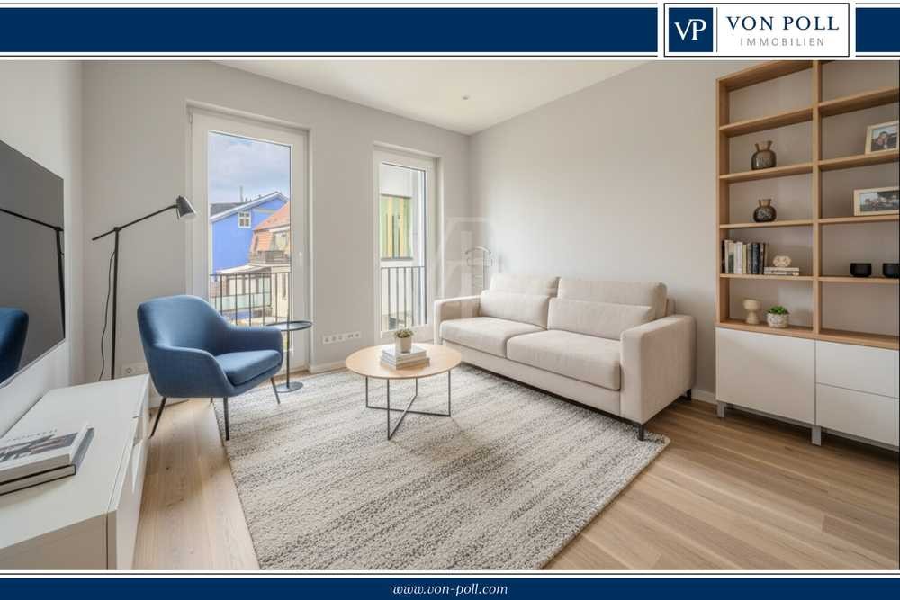 Die ca. 58 m² großen Wohnung bietet viele Gestaltungsmöglichkeiten. So kann das Wohnzimmer in die großzügige und mit allen modernen Geräten ausgestattete Küche integriert werden. Wenn Sie es eher klassisch lieben, können Sie aber auch eines der beiden anderen Zimmer zum zentralen Wohnbereich gestalten. In unserem Möblierungsvorschlag haben wir diese Variante schon einmal für Sie visualisiert. Ganz gleich, für welche Möglichkeit Sie sich entscheiden: Ein Sonnenbalkon mit Blick in den begrünten Innenhof und die kleinen Hausgärten lädt Sie in jedem Fall zum Verweilen ein.