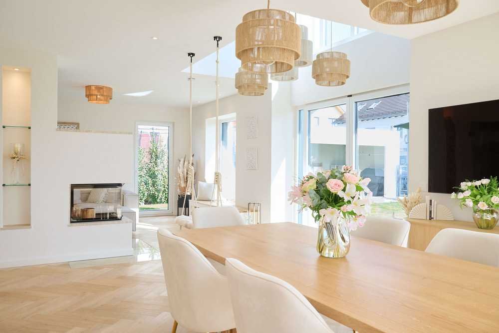 Direkt anschließend präsentiert sich die stylische Küche mit Kochinsel und einer edlen Arbeitsfläche aus Travertinstein, sowie hochwertigen Markengeräten. Der stilvolle Panoramakamin bildet das Herzstück zwischen Ess- und Wohnbereich und sorgt für eine gemütliche Atmosphäre.