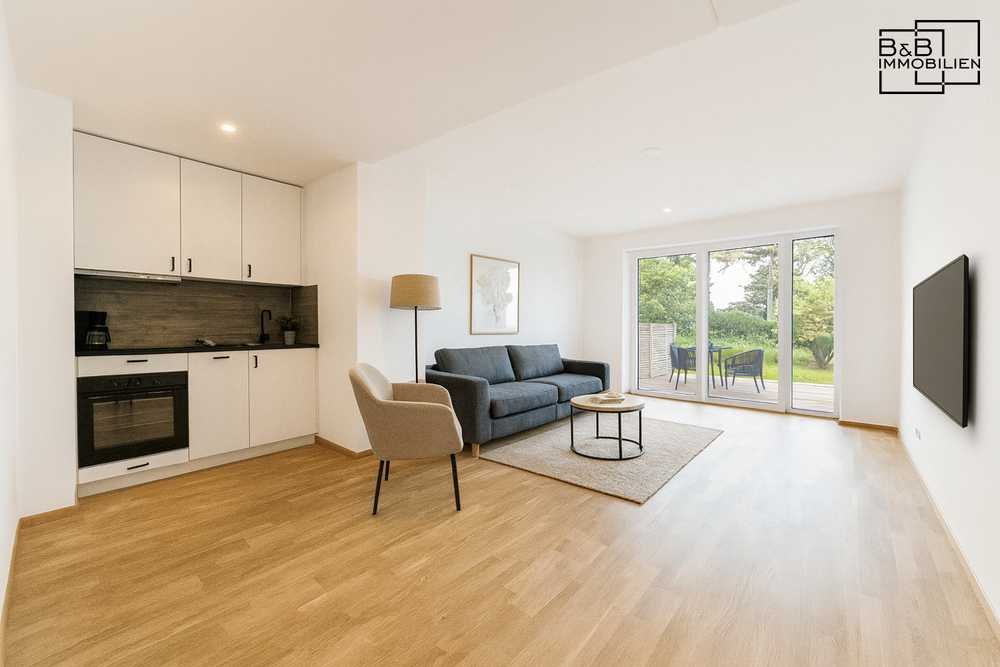 Dieses stilvolle 2-Zimmer-Apartment im Erdgeschoss mit Terrasse vereint modernes Wohnen mit höchstem Komfort. Bodentiefe Fenster sorgen für eine lichtdurchflutete Atmosphäre und schaffen eine offene, einladende Wohnqualität.