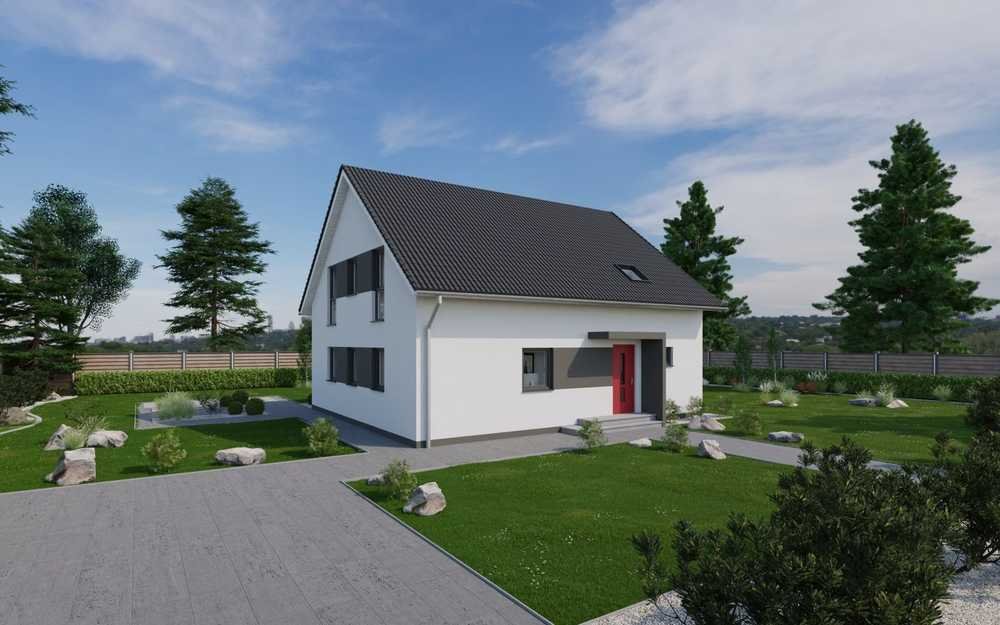 Auch die Erweiterung des Entwurfes, z. B. mit einem Erker, einem Balkon oder einer Haustürüberdachung bringt Charakter in die Architektur. Als Variante ist die Hausplanung ebenfalls mit einer Dachneigung von 38° und einem Kniestock von 1000 mm planbar. Durch die Dachschrägen im Dachgeschoss bietet sich ein besonderes beschützendes und gemütliches Wohnambiente, das direkt ein "Zuhause-Gefühl" vermittelt. Beide Wohnungen sind hell und freundlich. Dieser Hausentwurf kann virtuell in einer Visualisierungs-App bemustert werden.