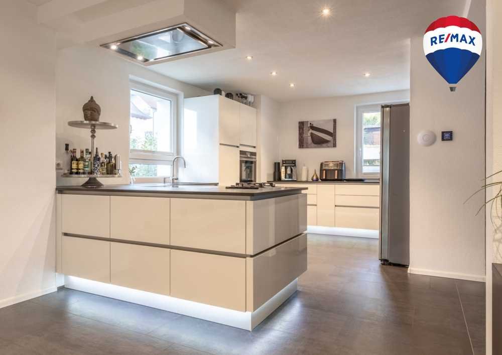 Die Hauptwohnebene im Erdgeschoss überzeugt durch ihre offene Gestaltung mit großzügigen Fensterflächen, die ein freundliches Ambiente schaffen. Der großzügige Wohnbereich bietet mit einer integrierten Projektor-Anlage echtes Heimkino-Feeling. Die moderne Einbauküche lässt keine Wünsche offen. Ein elegantes Gäste-WC mit Dusche ergänzt das Raumangebot.