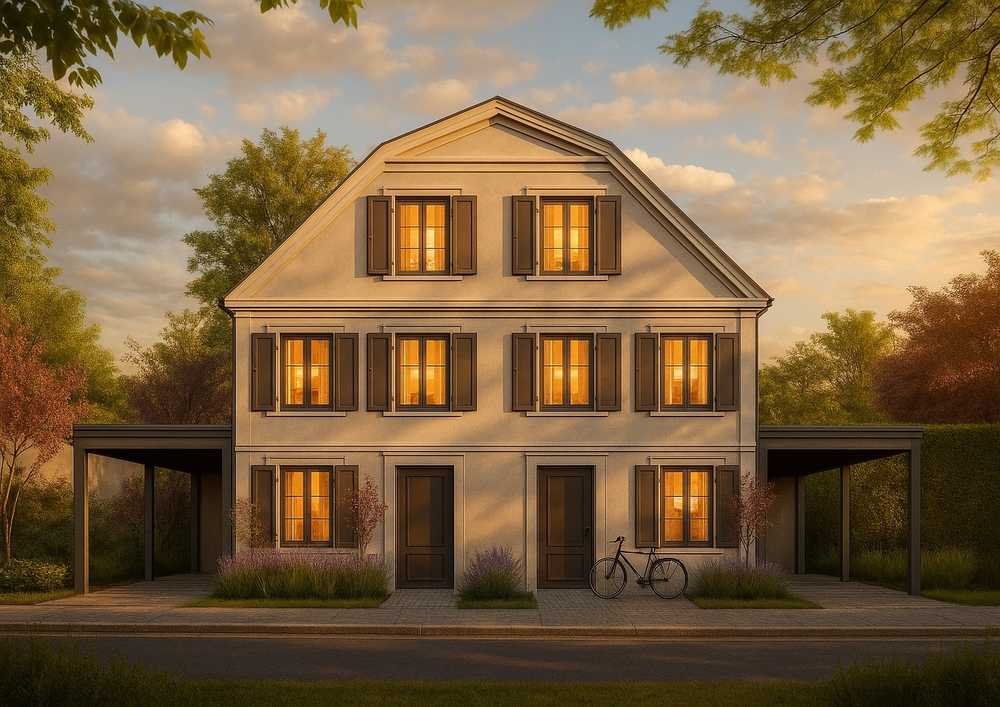 Diese von uns geplanten Villenhälften vereinen klassische Eleganz mit zeitgemäßer Architektur und beeindrucken durch ihre einzigartige, repräsentative Erscheinung.