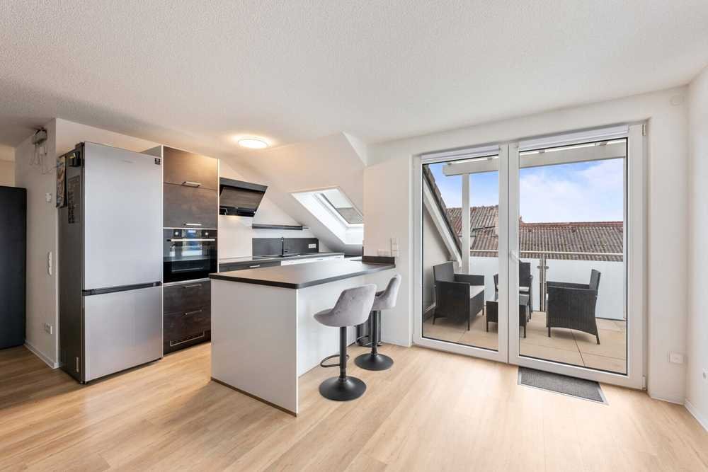 Über den freundlich gestalteten Eingangsbereich gelangen Sie in den offen angelegten Wohn- und Essbereich mit Zugang zum überdachten Balkon mit Glasdach, der ein angenehm helles und freundliches Ambiente bietet. Dank der Bauweise gibt es in der gesamten Wohnung lediglich wenig Dachschrägen, sodass die Flächen optimal genutzt werden können und ein harmonisches Raumgefühl entsteht.