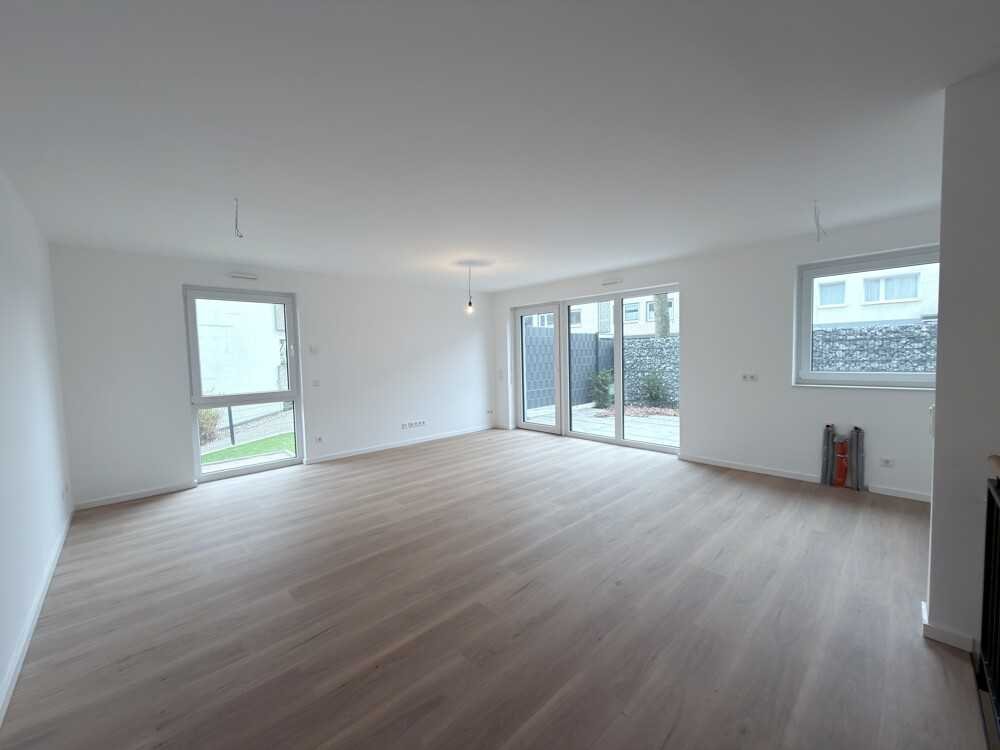 Der großzügige Wohn- und Essbereich mit offener Küche bietet Zugang zur Terrasse und dem eigenen Gartenanteil. Große bodentiefe Fenster sorgen für viel Tageslicht und schaffen eine helle, einladende Atmosphäre.