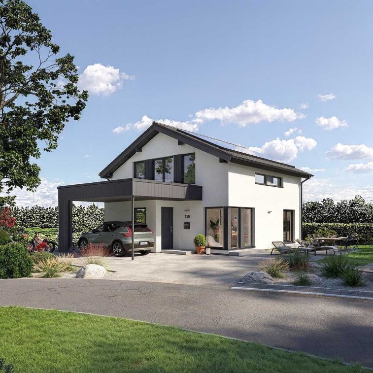 Das projektierte Fertighaus EVOLUTION 136 von Bien-Zenker kombiniert modernes Design mit durchdachter Funktionalität. Mit 140 m² Wohnfläche und einem großzügigen Grundstück von 1100 m² bietet dieses Haus ausreichend Raum für Ihre individuellen Wünsche und Bedürfnisse. Die Architektur beeindruckt mit zwei ansprechenden Satteldach-Varianten, die nicht nur optisch überzeugen, sondern auch ein harmonisches Wohnklima schaffen. Die intelligente Raumaufteilung im Erdgeschoss verbindet das Wohnen und Arbeiten perfekt mit den individuellen Rückzugsräumen im Obergeschoss. Besonders hervorzuheben ist die geradläufige Treppe, die die Diele zum einladenden Mittelpunkt des Hauses macht. Hier fühlen Sie sich sofort willkommen.