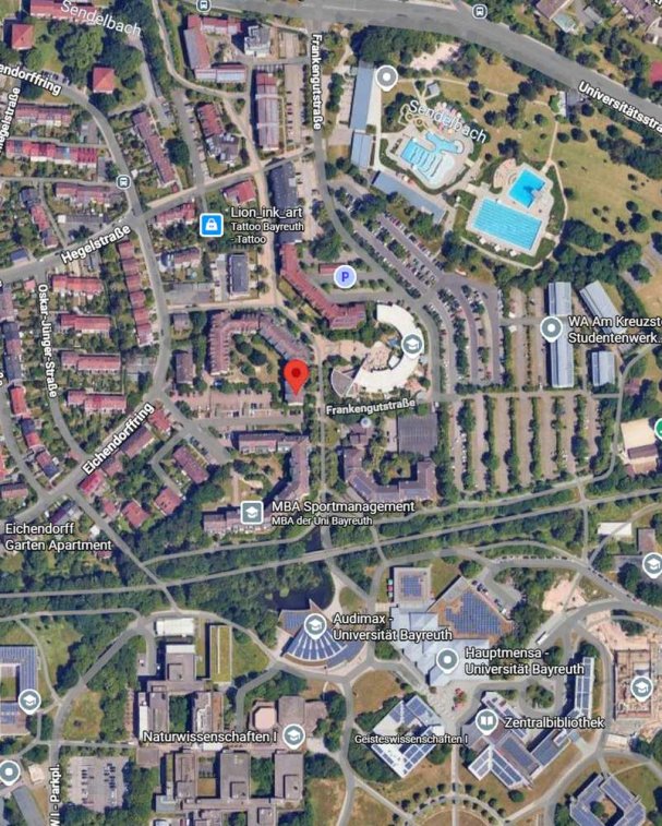 Die Wohnung befindet sich in äußerst ruhiger Lage zwischen dem Kreuzsteinbad und der Universität Bayreuth. Durch die hervorragende Aufteilung der Wohnung eignet diese sich entweder zur Vermietung als 3er Wohngemeinschaft oder zum Eigenbezug.