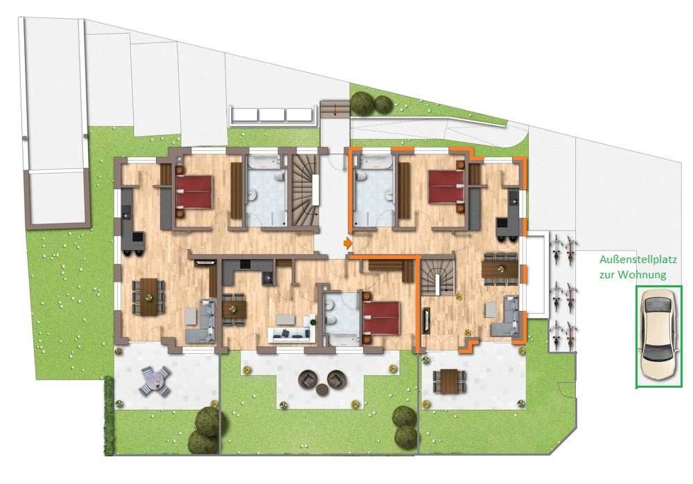 Der Außenstellplatz, mit einem Aufpreis von 5.000 € zu erwerben und befindet sich direkt am Garten mit direktem Zugang über die Gartentür.