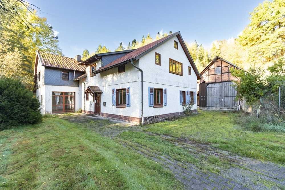 Inmitten einer idyllischen Naturlandschaft an den südlichen Ausläufern des Thüringer Waldes, unweit der Stadt Hildburghausen, liegt dieses außergewöhnliche Anwesen in absolut ruhiger und abgeschiedener Lage. Das Grundstück umfasst drei zusammenhängende Flurstücke mit einer Gesamtfläche von 5.469 m². Ein natürlicher Bachlauf, angrenzende Wald- und Wiesenflächen verleihen dem Ensemble einen besonderen Charakter und garantieren ein hohes Maß an Privatsphäre.