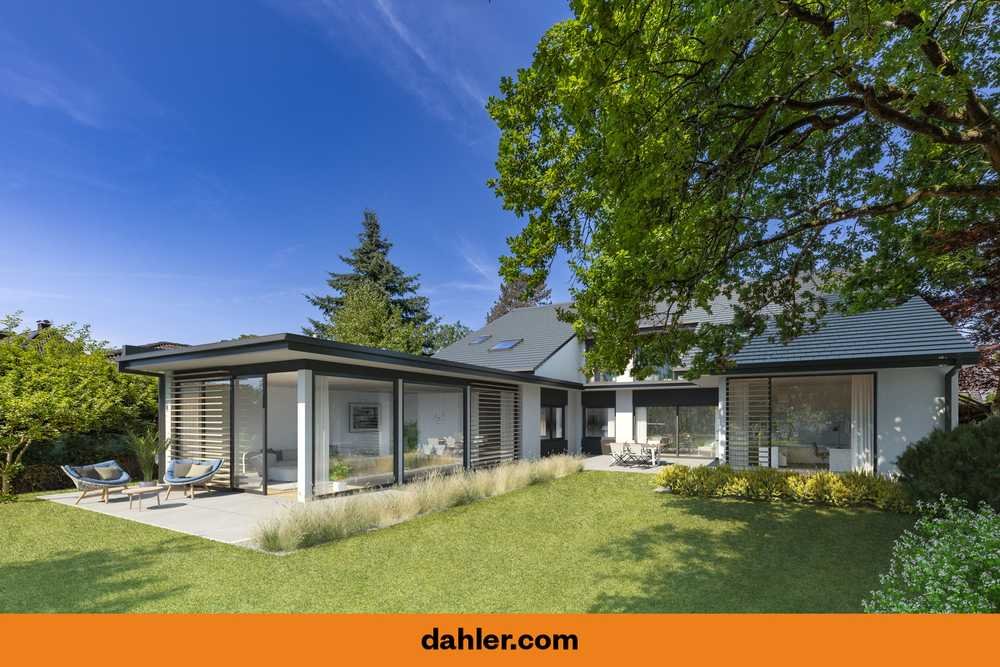 Die Raumaufteilung ist vielseitig und durchdacht. Das Erdgeschoss bietet neben Wohn- und Schlafbereichen auch ein großzügiges Tageslichtbad, zwei Gäste-WCs sowie ein Arbeits- oder Kinderzimmer. Ein besonderes architektonisches Highlight ist der großzügige Anbau auf der Rückseite des Hauses: Der frühere Schwimmbadbereich wurde vollständig verglast und stilvoll umgestaltet – ein lichtdurchfluteter Raum mit Blick ins Grüne, der heute vielfältige Möglichkeiten bietet. Ob als privater Wellnessbereich, Atelier, Fitnessraum oder ganz persönlicher Rückzugsort – dieser Raum wartet darauf, individuell interpretiert zu werden.