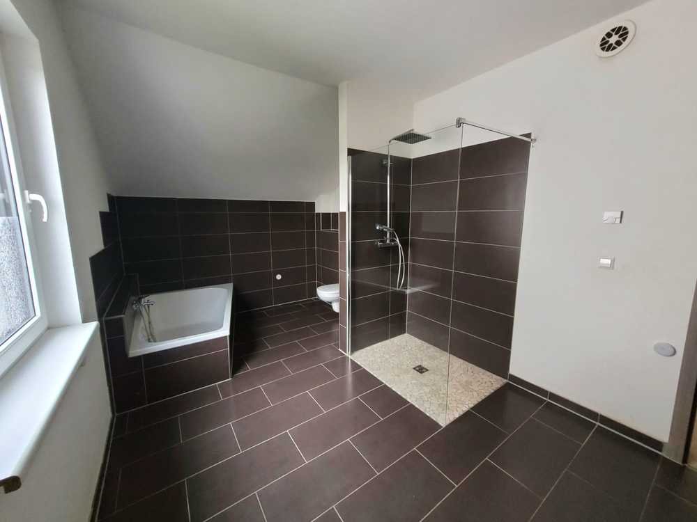 Im Obergeschoss befinden sich drei gut geschnittene Schlafzimmer sowie ein modernes Badezimmer mit Badewanne und Dusche. Besonders hervorzuheben sind die hohen Decken, die offene Galerie im Eingangsbereich und das Elternschlafzimmer mit begehbarem Kleiderschrank, die dem Haus eine großzügige, hochwertige Wohnatmosphäre verleihen.