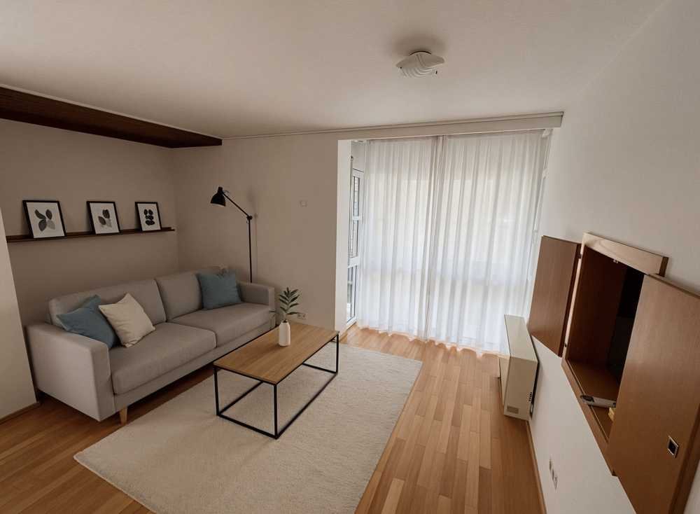Der Grundriss ist funktional und vielseitig nutzbar. Der helle Hauptbereich verfügt über Zugang zum überdachten Süd-West-Balkon. Ein weiterer Raum eignet sich als Schlafzimmer oder separates Büro. Ergänzt wird die Einheit durch eine abgeschlossene Küche (ohne Einbauküche) sowie ein Badezimmer mit Badewanne und Waschmaschinenanschluss.