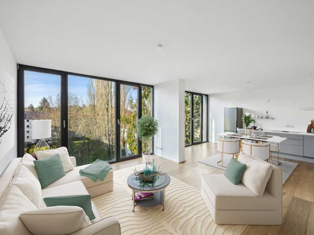 Schon beim Betreten der Wohnung im 5. Obergeschoss eröffnet sich neben dem Flur ein großzügiger, lichtdurchfluteter Wohnbereich, der durch seine offene Raumgestaltung und die hochwertige Ausstattung begeistert. Der weitläufige Essbereich mit offener Küche schafft ein einladendes Ambiente für entspannte Abende ebenso wie für gesellige Runden. Das angrenzende Schlafzimmer verfügt über ein stilvolles Bad en Suite, während ein separates Duschbad zusätzlichen Komfort bietet.