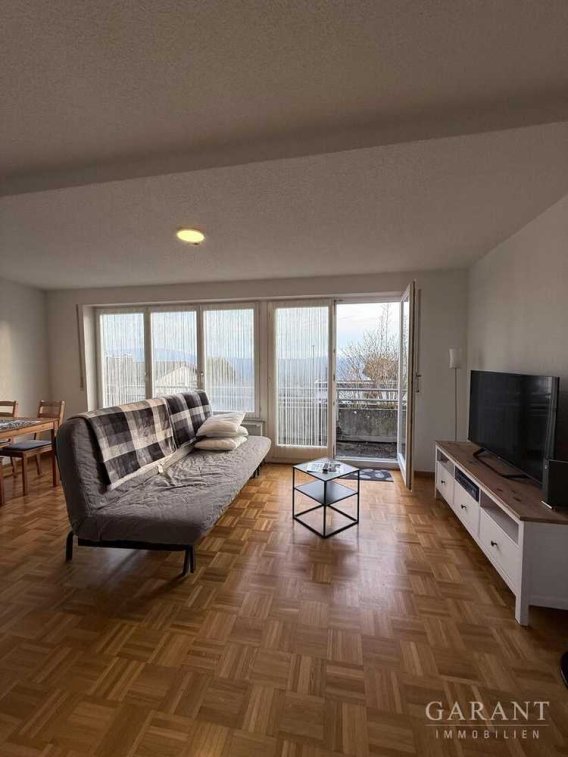 Vom Wohnzimmer gelangen Sie direkt auf den Balkon und den privaten Freisitz, von wo Sie je nach Wetterlage tolle Alpensicht, Ruhe und Entspannung genießen können.