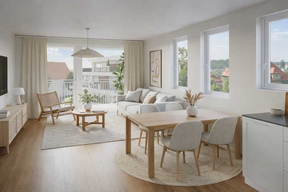 Der offene Wohnbereich bildet das Herzstück der Wohnung und bietet ausreichend Platz für Wohnen und Essen. Große Fenster sorgen für viel Tageslicht und schaffen eine freundliche Atmosphäre. Von hier aus besteht ein direkter Zugang auf den Balkon in westlicher Ausrichtung.