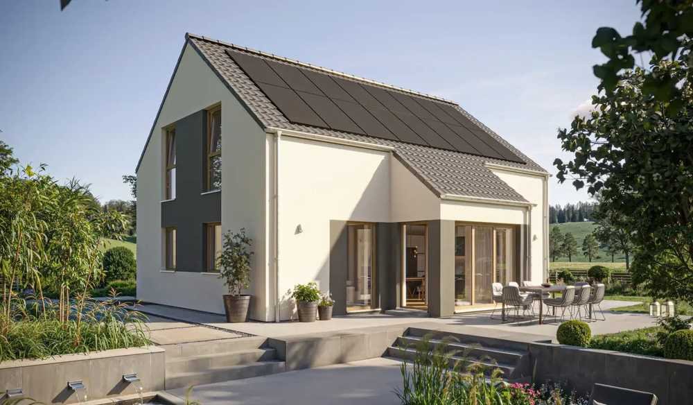 Sie suchen ein Haus mit dem "gewissen Etwas"? Dann ist das EVOLUTION 148 V2 genau das Richtige! Besonders reizvoll sind die perfekten Symmetrien, die dem Auge schmeicheln und Ruhe und Harmonie ausstrahlen. Das beginnt bei der Anordnung und Größe der Architekturelemente und reicht bis hin zur Farbgestaltung. Auf der Traufseite sind es die Fenster in zwei verschiedenen Formaten, die die Symmetrie bestimmen. Der Bereich zwischen den Lichtöffnungen wurde grau abgesetzt. Dadurch entsteht ein schöner Kontrast zur Hauptfarbe Weiß und den warmen Holzfensterrahmen. Gartenseitig liegt ein Erker mit bodentiefen Fenstern und abgeschlepptem Dach auf der Symmetrieachse. Er erstreckt sich über beide Etagen und schafft im Innenraum eine luftige Atmosphäre. Gekrönt wird das Fertighaus von einem steil geneigten Satteldach. Dessen große Dachflächen bieten optimale Voraussetzungen für die Installation einer leistungsfähigen Photovoltaikanlage, die den Großteil des Stromverbrauchs decken kann.