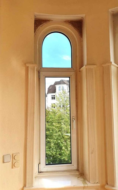 In der sehr großzügigen ca. 125 m² umfassenden Wohnung empfängt Sie ein altbautypisch geschnittener einladender Flur, von dem aus alle Räumlichkeiten erreichbar sind. Zur Linken finden Sie die Küche, das Bad und ein Gäste-WC. An die Küche schließt sich ein kleiner Balkon zum Hof an. Dieser muss entweder vollständig neu aufgebaut oder abgerissen und durch ein Gitter zum sogenannten französischen Balkon umgewandelt werden. In beiden Fällen trägt der Erwerber die Kosten. Nach vorne heraus mit einem Blick zum schönen grünen Arndtplatz liegen die vier großen Zimmer. Am Ende des Flurs befindet sich dass beeindruckende wunderschöne Erkerzimmer mit seinen besonderen Rundbogenfenstern. Zum Erkerzimmer hin ist die Tür vom Flur aus geschlossen worden, so dass dieses Zimmer zurzeit durch das danebenliegende Zimmer betreten werden kann. Dies lässt sich aber selbstverständlich im Zuge der Renovierungsmaßnahmen wieder in den alten Grundriss mit Zugang vom Flur aus zurückbauen. In diesem Zimmer ist sogar noch der schöne altbautypische große Durchgang mit der historischen Holzschiebetür zwischen den Zimmern erhalten. Alle Zimmer sind lichtdurchflutet und können durch ihre ähnliche Größe auf jede gewünschte Weise genutzt werden.