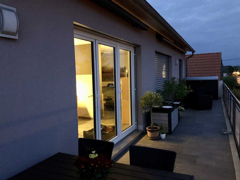 Eine 32 m² große Süd-Dachterrasse bietet das perfekte Wohnzimmer im Freien. Die Terrasse wird bei Bedarf durch zwei vollelektrische Markilux-Markisen mit Windwächter beschattet. Dort ist auch ein Kochplatz mit einem Gastrotisch vorhanden, eine ideale Möglichkeit, um dort zu grillen oder zu kochen. Der Bodenbelag aus der Wohnung setzt sich auf der Terrasse optisch nahtlos fort (Terrassenplatten aus derselben Serie).