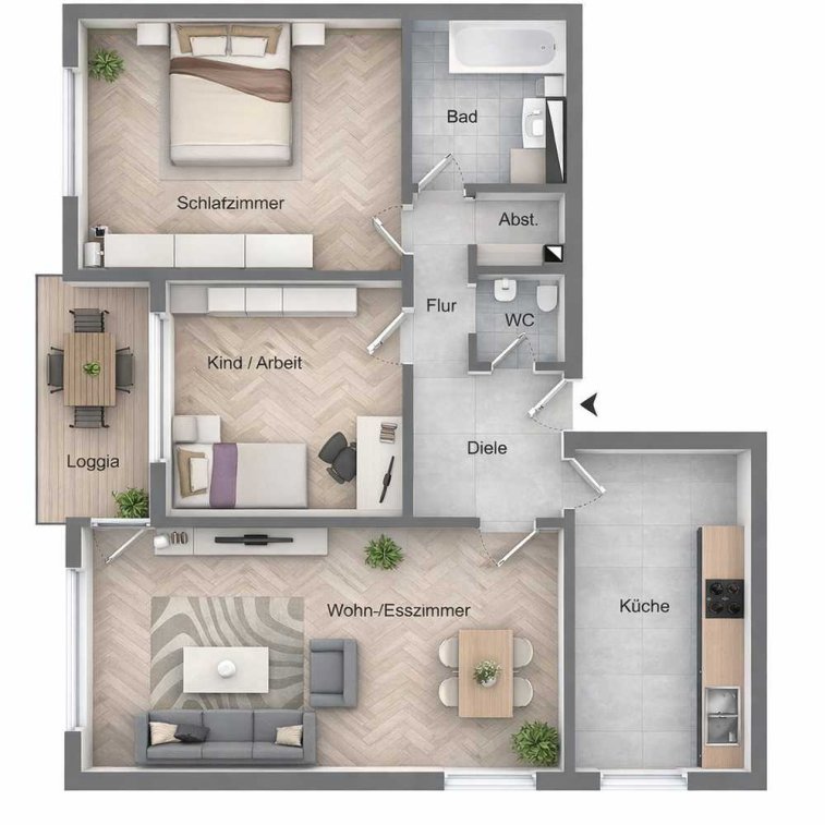 Der lichtdurchflutete Wohn- und Essbereich bietet direkten Zugang zur Loggia mit Blick ins Grüne. Zwei geräumige Schlafzimmer lassen sich flexibel als Elternschlafzimmer und Kinderzimmer oder Homeoffice nutzen. Die Küche profitiert von der Morgensonne und bietet ausreichend Platz für eine gemütliche Frühstücksecke.