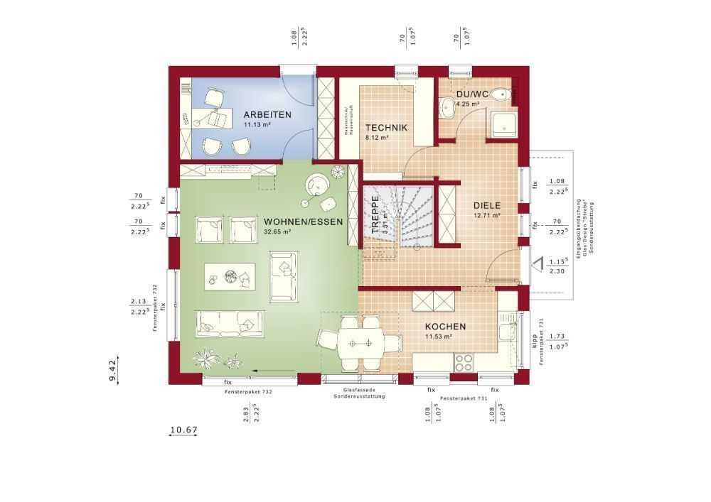 Willkommen in Ihrem zukünftigen Zuhause, einem modernen Fertighaus, das ganz nach Ihren Wünschen und Vorstellungen projektiert wird. Das Haus, das Sie im Herzen von Königshofen erwartet, beeindruckt nicht nur durch seine ansprechende Architektur, sondern auch durch die Flexibilität, die es Ihnen bietet. Ob Sie sich für ein Satteldach, Walmdach oder Flachdach entscheiden, die Möglichkeiten sind vielfältig und maßgeschneidert auf Ihre Bedürfnisse. Der durchdachte Grundriss des EVOLUTION 152 erstreckt sich über 152 Quadratmeter, aufgeteilt in fünf Zimmer, die ein harmonisches Wohnambiente schaffen. Im Erdgeschoss finden Sie ein großzügiges Arbeitszimmer, das Ihnen Ruhe und Konzentration bietet, während Sie im Obergeschoss zwei lichtdurchflutete Kinderzimmer und eine Ankleide entdecken, die den Raum für Ihre Familie optimal nutzt. Hier genießen Sie nicht nur Privatsphäre, sondern auch Gemeinschaftsgefühl - der perfekte Ort für unvergessliche Momente mit Ihren Liebsten.